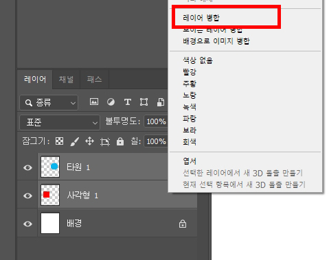 선택 후 오른쪽 마우스를 클릭하면, [레이어 병합]이 있다. 클릭해준다.